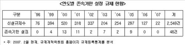 특히 행정규제기본법은 '명백한 사유'가 없는 한 모든 규제에 존속기한을 설정하도록 하고 있지만, 2006년 이후에 신설된 규제 중 존속기한이 설정된 사례는 단 한건도 없었다.(표 참조)