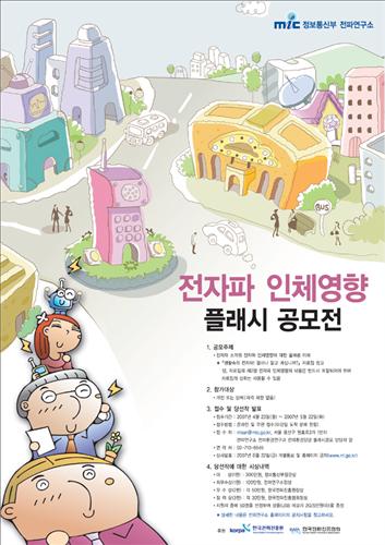 정보통신부 전파연구소에서는 오는 4월 23일부터 5월 22일까지 '전자파 인체영향 플래시 공모전'을 실시한다. 정보통신이 발달함에 따라 휴대용 무선통신기기(휴대전화, PDA 등)의 사용이 증가하여 전자파의 인체영향에 대한 국민들의 우려가 급증하고 있다. 그래서 전자파 인체영향에 대한 일반인들의 관심을 유도하고 전자파에 대한 막연한 불안감을 해소하기 위하여 플래시 공모전을 개최하기로 한 것이다.