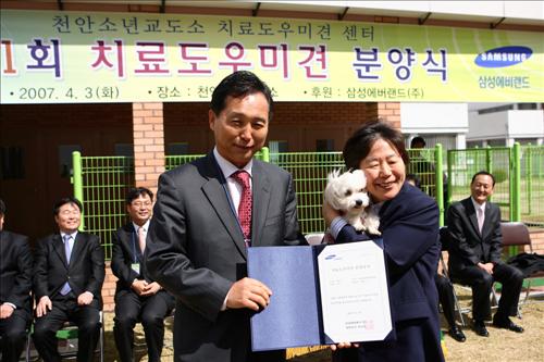 금번 소년교도소內 치료도우미견 프로그램의 도입은 삼성에버랜드가 사회공헌사업의 일환으로 도우미견센터를 건립하고 유기견 선발 및 분양, 훈련지도 등을 지원하였으며, 천안소년교도소는 프로그램에 참가한 수형자의 선발과 시설관리 유지 등 전반적인 운영을 담당하였다. 총 36평 규모로 건립된 도우미견센터는 개들이 지내는 견사와 방사장, 휴게실, 탈의실 등으로 구성되었다.
