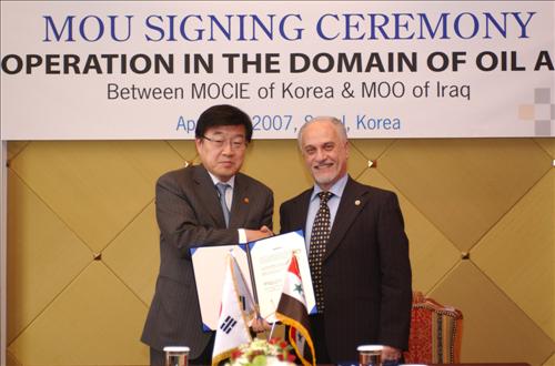 산업자원부 김영주 장관은 4.12(목), 신라호텔에서 이라크 샤리스타니(Shahristani) 석유부 장관 및 산업부장관과『1+2 장관급 회담』을 갖고 유전개발 및 산업협력 방안을 논의한 후 『한-이라크 포괄적 유전개발 협력 MOU』를 체결 했음