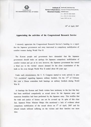 독립기념관(관장 김삼웅)은 미 의회 조사국이 2차 세계대전 당시 일본정부와 일본군이 '군위안부' 강제 동원에 직접 개입하였다는 정확한 보고서를 미 하원(외교위원회 아시아태평양환경소위원회)에 제출한 것과 관련하여 이를 격려하는 영문 서한문(″미 의회 조사국의 노고를 격려함〃)을 4월 17일 미 의회조사국에 보냈다.