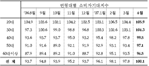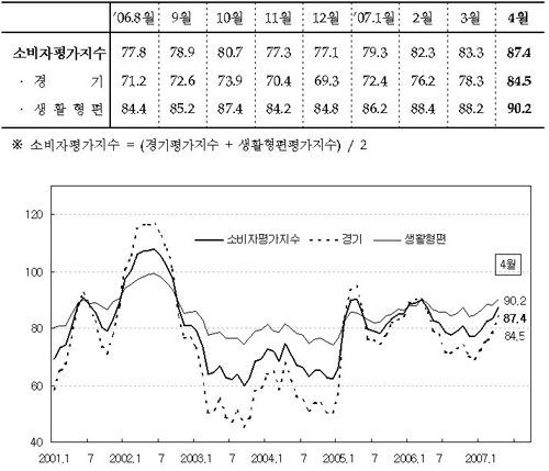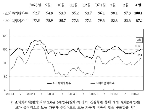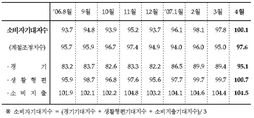 통계청이 오늘 발표한 지난달의 소비자전망조사 결과에 따르면 소비자 기대지수가 100.1로 3월보다 2.3포인트 상승하며 1년 만에 기준치를 돌파한 것으로 나타났다.