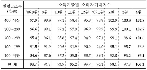 다만 소득계층별로 월평균 백만원 미만과 백만원대 수입 계층의 기대지수는 여전히 기준치에 미달하는 것으로 조사됐다.