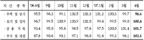 한편 6개월 전과 비교하여 현재의 자산 가치에 대한 소비자들의 주관적인 평가를 나타내는 자산평가지수를 보면 주택 및 상가평가지수는 전월보다 하락하였으나, 다른 모든 부문의 자산평가지수는 전월보다 상승하여 기준치 100을 상회하였다.