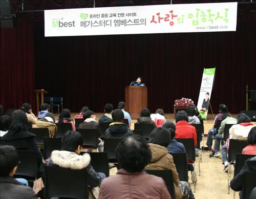 온라인중등교육사이트 메가스터디 엠베스트(www.mbest.co.kr/대표 김성오)는 가정 형편이 어려운 학생들의 중학교 입학준비를 돕는 '사랑의 입학식'을 오늘 2월 8일, 서울시립보라매수련관에서 진행했다.