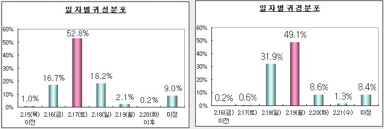 고향 길 중 가장 혼잡이 예상되는 날은 설날 전날인 2월 17일로 응답자의 52.8%가 답해 이날을 피해 출발하는 것이 수월할 것으로 예상되며, 반대로 귀경 길은 응답자의 49.1%가 설 다음날인 2월 19일이라고 답해 이날 본격적으로 귀경 차량이 몰릴 것으로 예상된다.