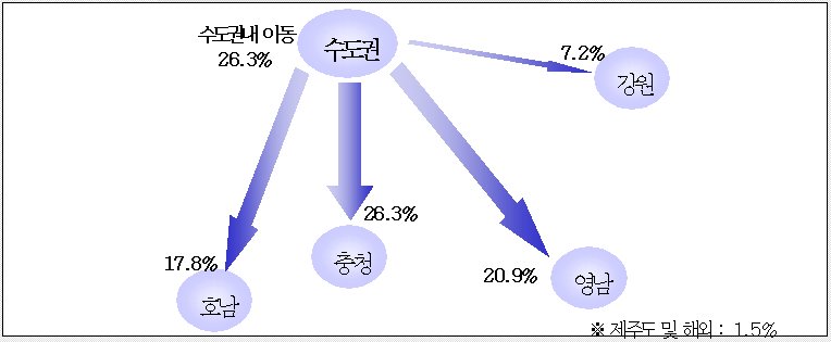 특히 수도권 지역 거주자의 귀성 목적지로 수도권 내에서의 이동과 충청권으로의 이동이 각각 26.3%로 가장 높았으며, 이어 영남권 20.9%, 호남권 17.8% 순으로 나타나 경부선과 중부선 및 서해안선의 혼잡이 클 것으로 예상된다.