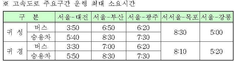 주요 구간별 최대 예상 소요시간은 승용차 기준으로 귀성길의 경우 서울-대전은 5시간 40분, 서울-부산은 8시간30분, 서울-광주는 7시간30분이 소요될 것으로 예상되며, 버스전용차로를 이용할 경우에는 이보다 최대 1시간에서 2시간 정도 줄어들 것으로 추정된다.