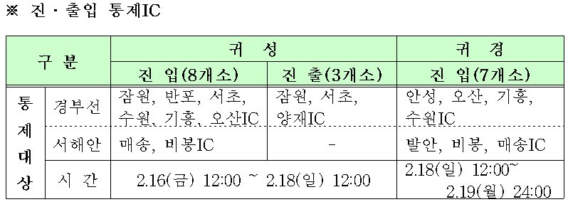 고속도로 IC통제도 실시하는데, 귀성 시에는 2월 16일(금) 12시부터 2월 18일(일) 12시까지 경부고속도로 잠원, 서초IC는 진?출입 모두 통제, 반포, 수원, 기흥, 오산IC는 진입 통제, 양재IC는 진출만 통제하되, 반포?서초IC에서는 P턴 진입을 허용하고, 서해안고속도로 매송, 비봉IC의 진입을 통제한다.