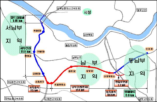 - 금천 시흥동~서초 우면동간 왕복 6차로, 연장 12.4km 우선착공