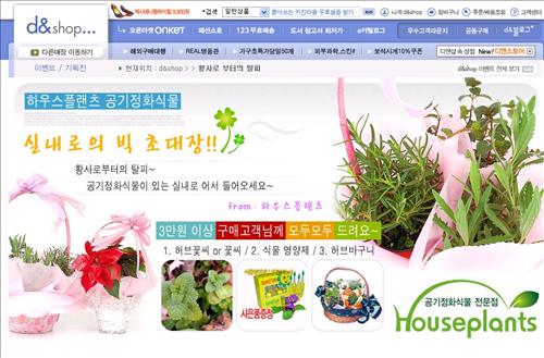 또한, 디앤샵은 하우스플랜츠 공기정화식물 기획전을 통해 1만원에서 4만원대의 다양한 상품을 판매하고 3만원 이상 구매고객에게 허브꽃씨와 식물영양제, 허브바구니를 사은품으로 증정한다. 산세베리아, 자보, 윌마 등의 공기정화식물은 음이온 방출, 발암물질인 포름알데히드 흡수, 전자파 차단 등의 기능을 통해 황사철 집안의 공기를 정화해 주는 동시에 인테리어 효과도 준다.