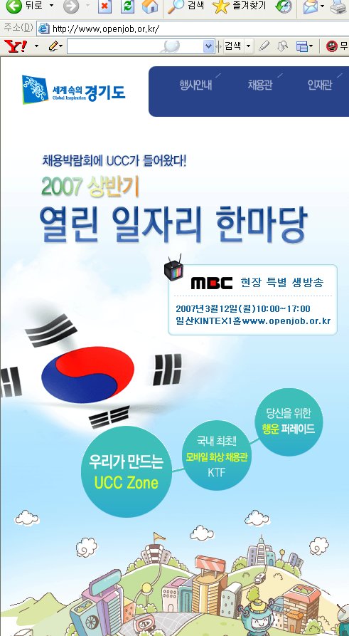 경기도가 주최하고 취업포털 커리어가 주관하는 '2007 상반기 열린 일자리 한마당'이 오는 3월 12일(월) 한국국제전시장(KINTEX)에서 오전 10시부터 오후5시까지 개최된다.