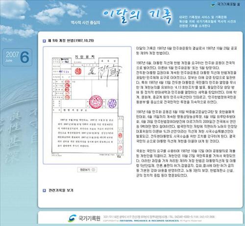행정자치부 국가기록원(원장 조윤명)은 기록문화 확산 및 대국민 기록정보 서비스의 일환으로 국가기록포털(contents.archives.go.kr)에 '이 달의 기록' 코너를 신설하고 6월 29일부터 서비스를 시작한다고 밝혔다.