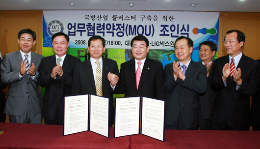 박성효 대전시장은 26일 오후 4시 첨단 방산무기 연구개발 및 생산을 전문으로 하는 LIG넥스원 이효구 대표이사와 국방클러스터 구축을 위한 업무협약을 체결했다.