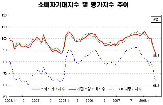 6개월 전과 비교해 현재의 경기, 생활형편에 대한 평가를 나타내는 소비자평가지수 또한 전월(72.2)보다 10.9p 하락한 61.3으로 나타났다. 이는 2003년 9월(59.9)이후 57개월만에 최저수준이다.