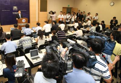 일본이 중학교 교과서 해설서에 독도를 일본령으로 주장하는 내용을 포함시키기로 한 것과 관련, 14일 오후 외교통상부 문태영 대변인이 “즉각 시정”을 요구하는 성명을 발표하고 있다
