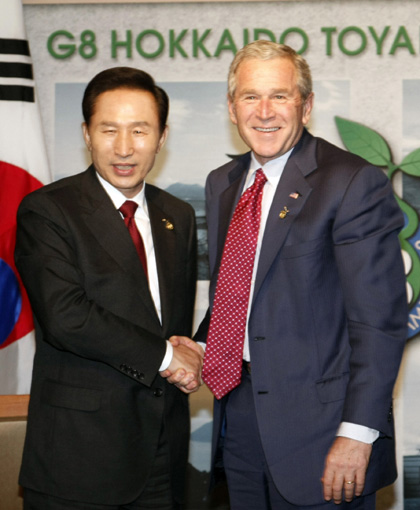 지난 7월9일 G-8 확대정상회의가 열린 일본 도야코 윈저호텔에서 정상회담을 마친 후 악수하는 모습