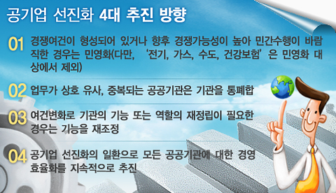새 정부는 ‘공기업 선진화’ 추진을 위해 4대 원칙을 세웠다.