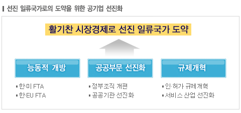 선진국의 기본조건은 경제활성화를 통해 지속가능한 성장이 이뤄지도록 시스템을 설계하는 데 있다. 이를 위해서는 민간의 자율과 창의에 입각한 ‘시장경제’가 활성화 하도록 시스템을 갖추고, 특히 공공영역 중에서 민간이 더 잘할 수 있는 분야는 민간에 맡겨 효율성을 극대화하자는 것이 ‘공기업 선진화’의 근본 취지이다.