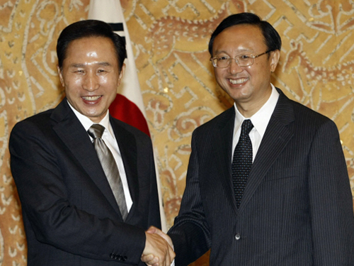 이명박 대통령이 13일 오후 청와대에서 양제츠 중국 외교부장을 접견, 악수를 하고 있다