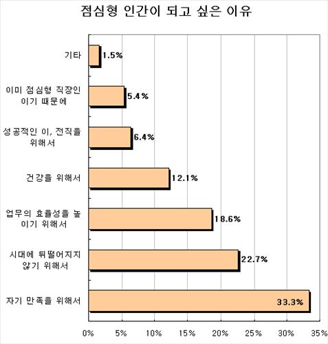 점심형 인간이 되고 싶은 이유로는 '자기 만족을 위해서'가 33.3%로 가장 높았다. 그다음으로는 '시대에 뒤떨어지지 않기 위해서' 22.7%, '업무의 효율성을 높이기 위해서' 18.6%, '건강을 위해서' 12.1% 등이 뒤를 이었다.