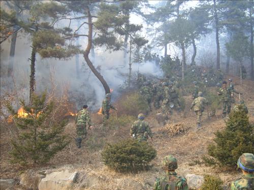군단급 야외기동훈련(3.15∼3.21) 참가 중이던 육군 제20기계화보병사단은 19일 오후 경기도 안성시 죽산면 일대 야산에서 발생한 화재에 발 빠르게 대처하여 대형산불을 예방했다.
