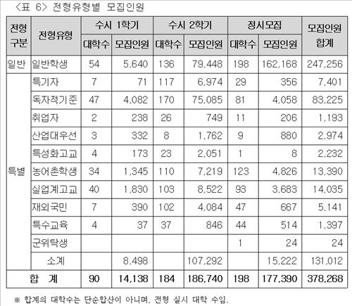 총모집인원은 378,268명으로 일반전형이 247,256명(65.4%)이고, 특별전형이 131,012명(34.6%)이다.
