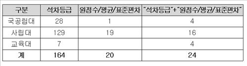 대학수학능력시험은 100% 반영하는 대학이 28개교, 80%이상이 11개교, 60%이상이 37개교, 50%이상이 101개교, 40%이상이 67개교, 30%이상이 16개교이고, 30% 미만이 2개교이며,
