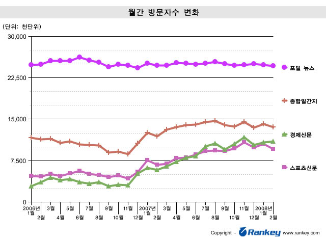 2006년부터 2008년까지 매년 2월의 분야별 방문자수 비교에서는 경제신문이 210%, 스포츠신문이 107%, 종합일간지가 20%증가했고, 포털 뉴스의 방문자수는 1.04% 감소하여 정체를 보이고 있다.