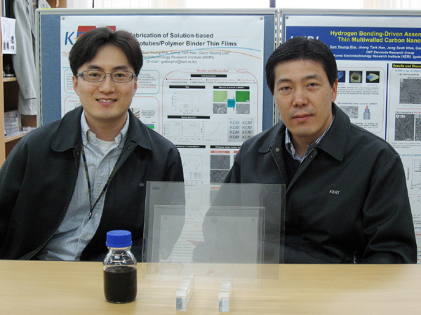 한국전기연구원(원장 박동욱 www.keri.re.kr) 이건웅 박사팀은 최근 자체 기본연구사업을 통해 초박막 제조가 가능하고 공정단가를 획기적으로 낮출 수 있는 탄소나노튜브 투명전극 제조용 일액형(一液形) 코팅액을 세계최초로 개발했다고 밝혔다.
