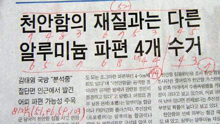 분석하는 기사제목 : 천안함의 재질과는 다른 알루미늄 파편4개 수거 - 조선A1면